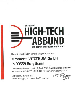 Die Zimmerei Vitzthum GmbH ist Mitglied beim Verband High-Tech Abbund im Zimmererhandwerk e.V. |