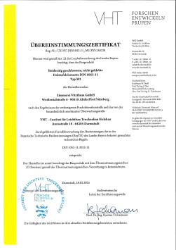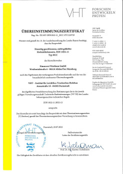 Die Zimmerei Vitzthum GmbH steht unter ständiger Überwachung durch das Institut für Holzbau VHT GmbH und ist berechtigt, das Bauprodukt "Einseitig geschlossene, nicht geklebte Holztafelelemente" mit dem Übereinstimmungszeichen entsprechend der Übereinstimmungszeichen-Verordnung zu kennzeichnen. |